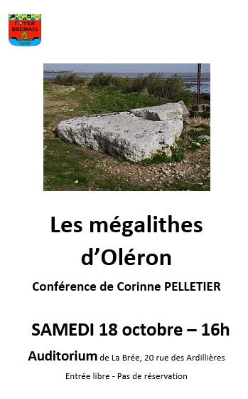 Conférence Les mégalithes d’Oléron + Ajouter à mon Agenda Google + iCal / Outlook export Date 18 Oct 2025 Expiré ! Heure 16:00 - 18:00 Lieu Auditorium La Brée les Bains Organisateur Foyer Brénais Téléphone 05 46757701 Partagez cet événement mars 2026 Mar 21 2026 Conférence Les guerres de religion Auditorium avril 2026 Avr 18 2026 Conférence Guillaume le Conquérant Auditorium mai 2026 Mai 23 2026 Conférence Les grandes tempêtes à Oléron Auditorium juin 2026 Juin 20 2026 Conférence Le « Ring » de R. Wagner (150 ans) Auditorium Pas d'événement actuellement programmé.